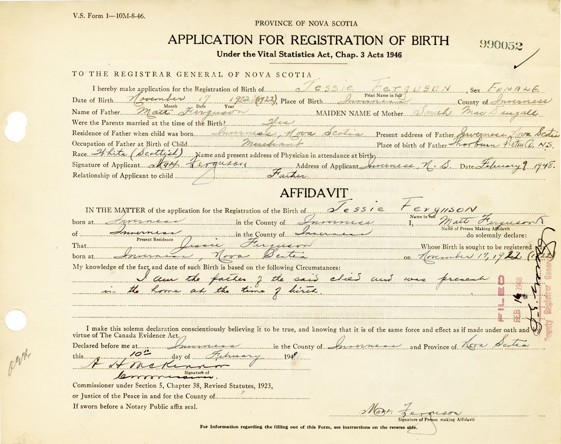 Signature of Applicant Matt Ferguson Address of Applicant Inverness Date 9 February 1948