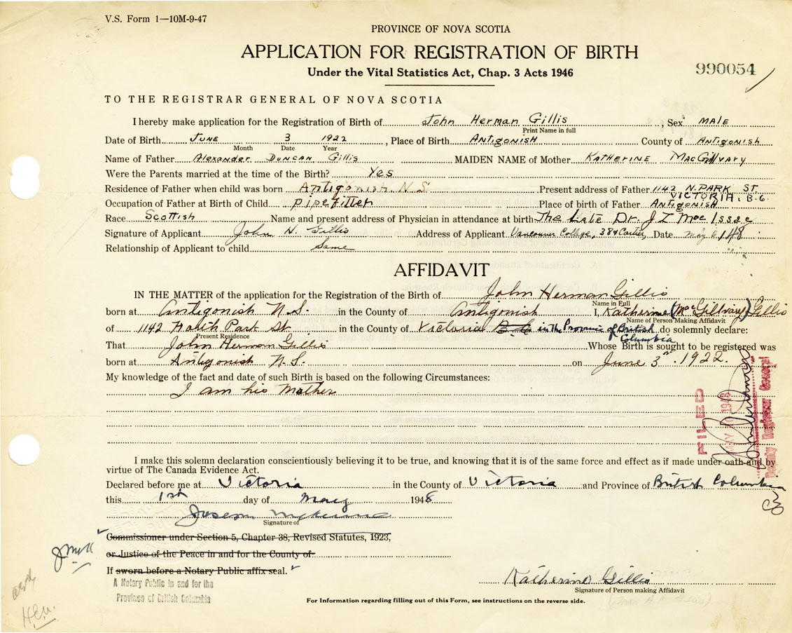 IN THE MATTER of the application for the Registration of the Birth of John HermanGillis