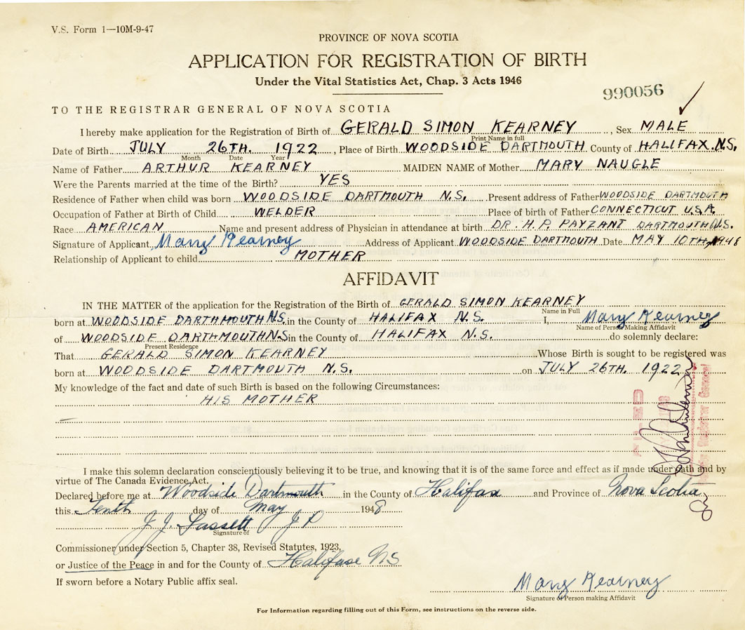 Signature of Applicant Mary Kearney Address of Applicant Woodside, Dartmouth, Halifax Date 10 May 1948