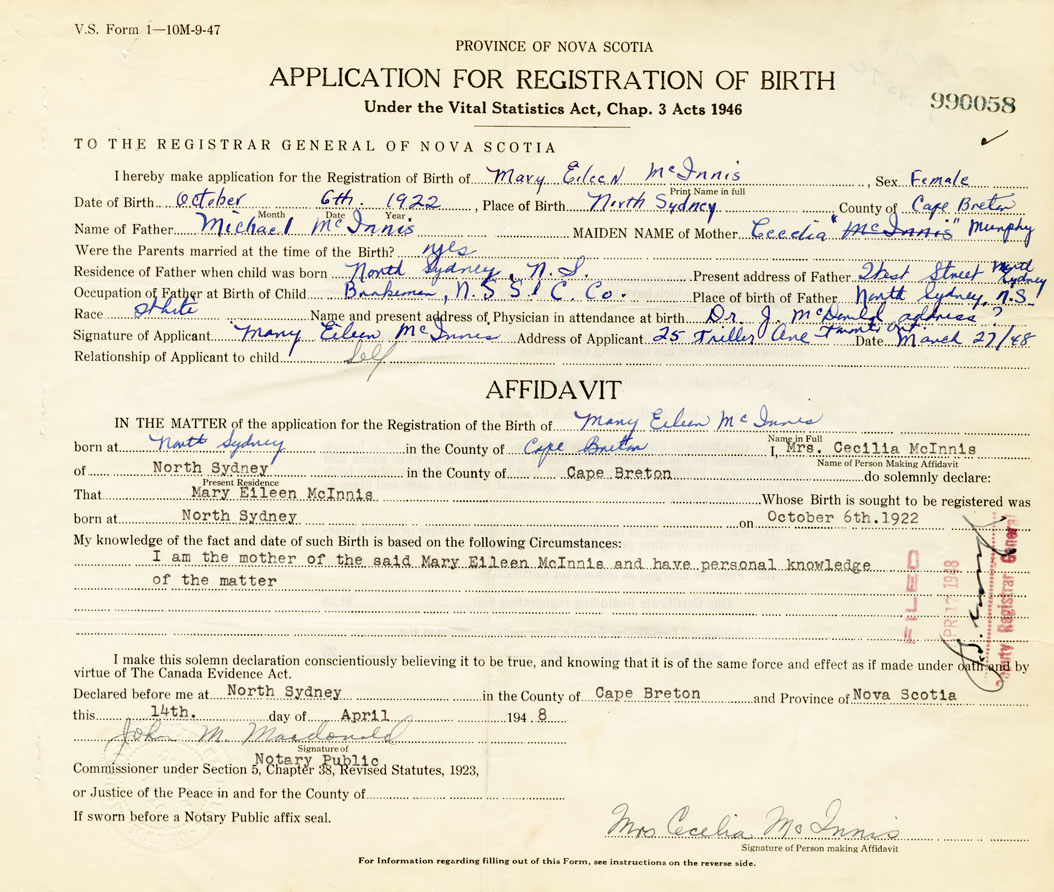 Signature of Applicant Mary Eileen McInnes Address of Applicant 25 Triller Avenue, Toronto, Ontario Date 27 March 1948