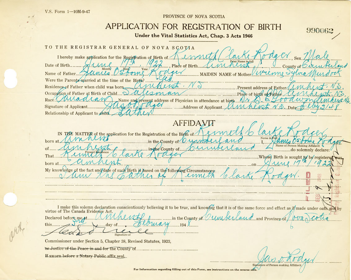 I hereby make application for the Registration of Birth of Kenneth ClarkeRodger Sex Male