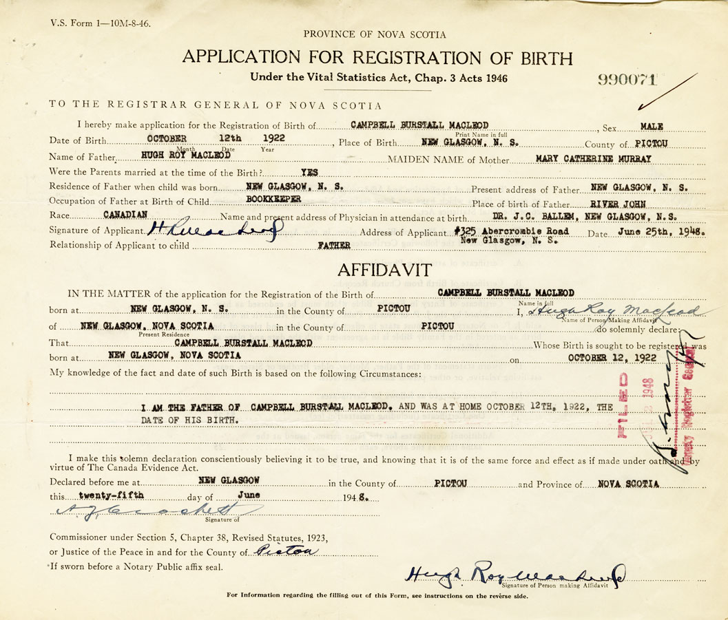 I am the father of Campbell Burstall MacLeod and was at home on October 12th, 1922, the date of his birth.