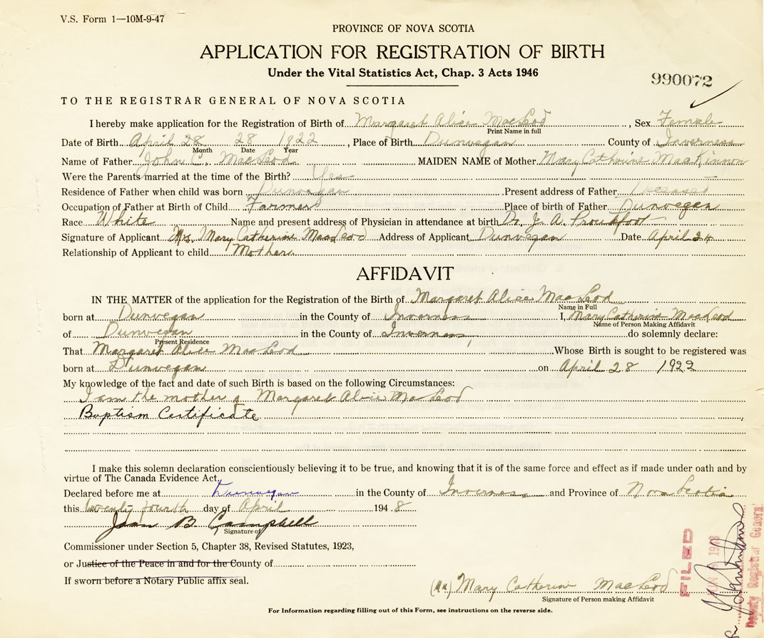 Signature of Applicant Mrs. Mary Catherine MacLeod Address of Applicant Dunvegan, Inverness Date 24 April 1948