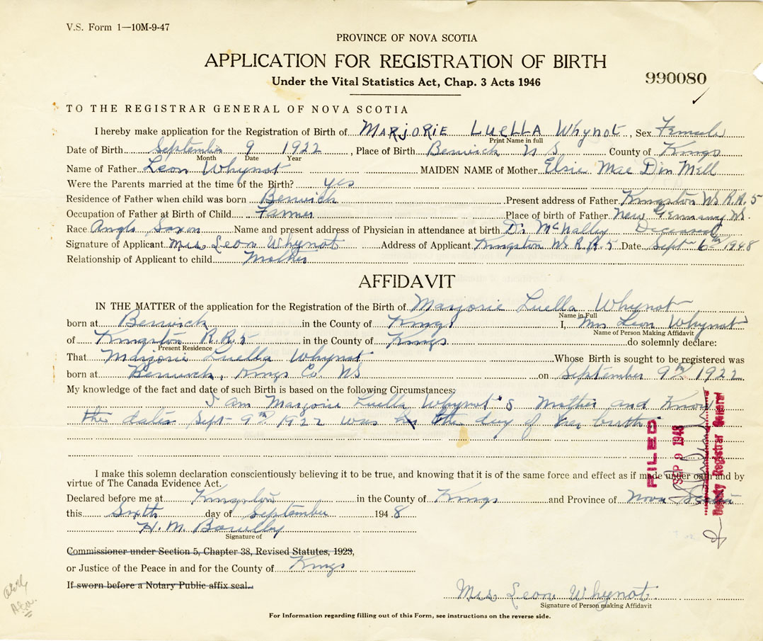 I hereby make application for the Registration of Birth of Marjorie LuellaWhynot Sex Female
