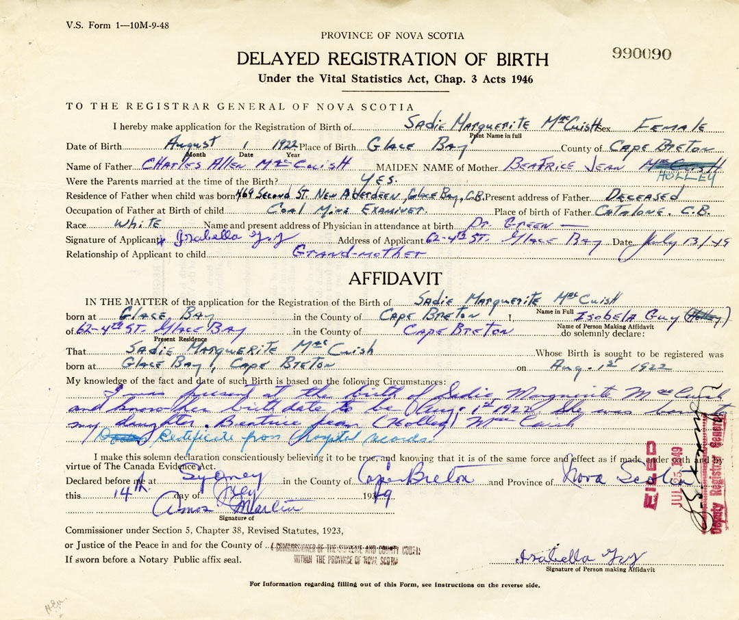 I was present at the birth of Sadie Marguerite MacCuish and know her birth date to be August 1st, 1922. She was born to my daughter, Beatrice Jean (Holley) MacCuish. Certificate from hospital records.