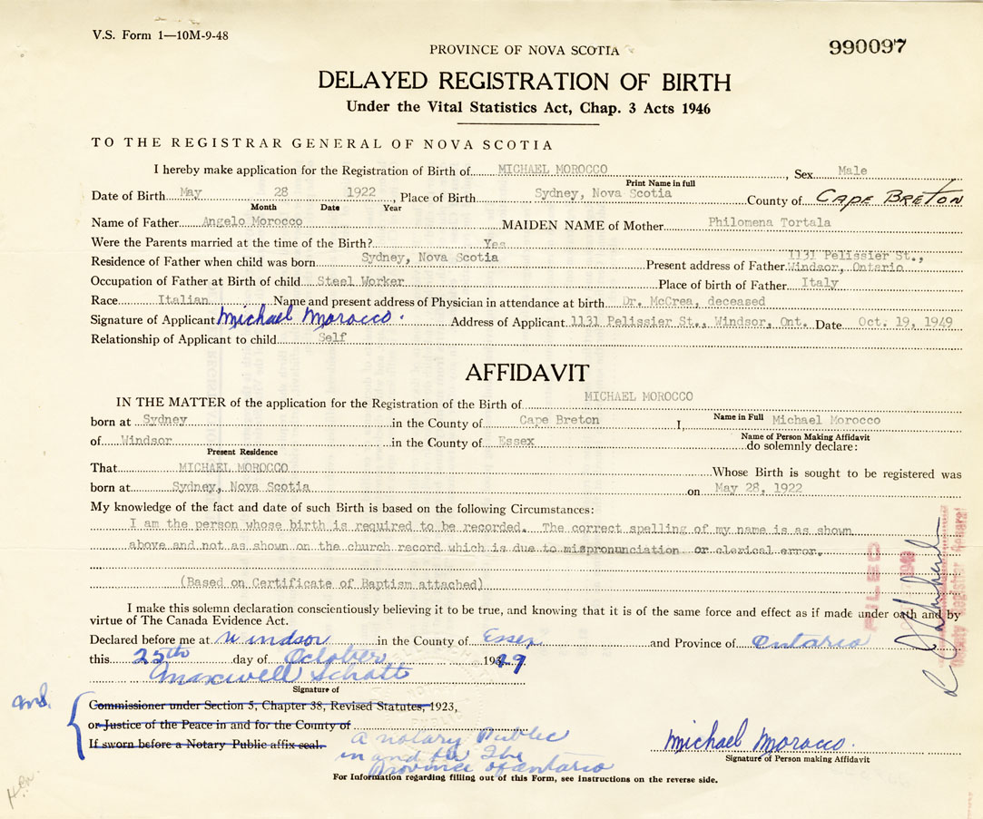 Signature of Applicant Michael Morocco Address of Applicant 1131 Pelissier Street, Windsor, Ontario Date 19 October 1949
