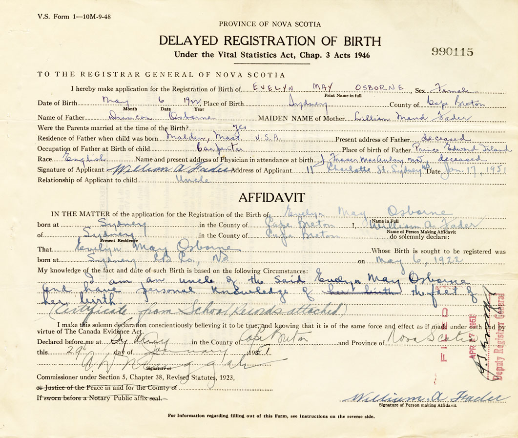 I am an uncle of the said Evelyn May Osborne and have personal knowledge of the fact of her birth (certificate from school records attached)