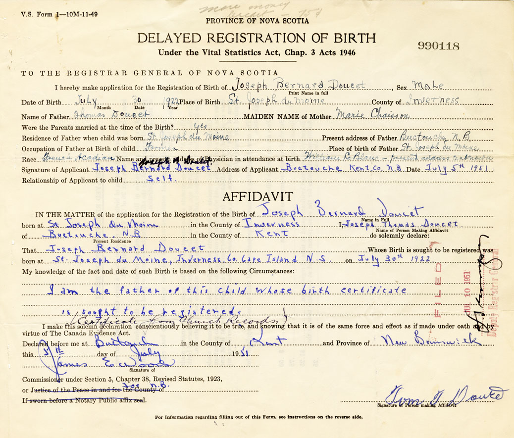 Signature of Applicant Joseph Bernard Doucet Address of Applicant Buctouche, Kent, New Brunswick Date 5 July 1951