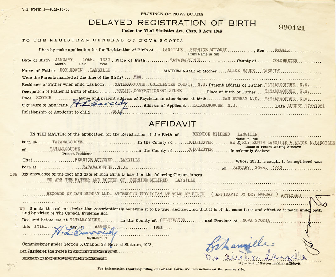 We are the father and mother of Bernice Mildred Langille. Records of Dan Murray M.D., attending Physician at time of birth (affidavit by Dr. Murray) attached