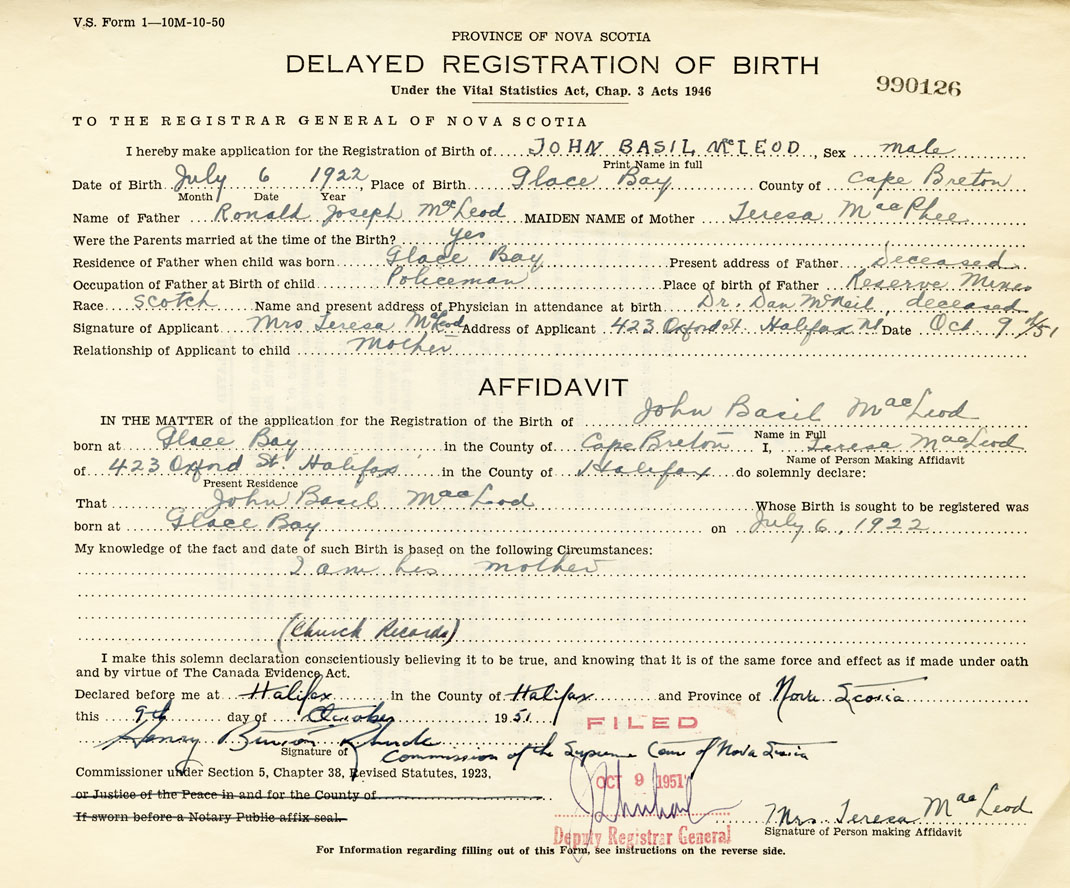 Date of Birth July 6, 1922 Place of Birth Glace BayCounty of Cape Breton