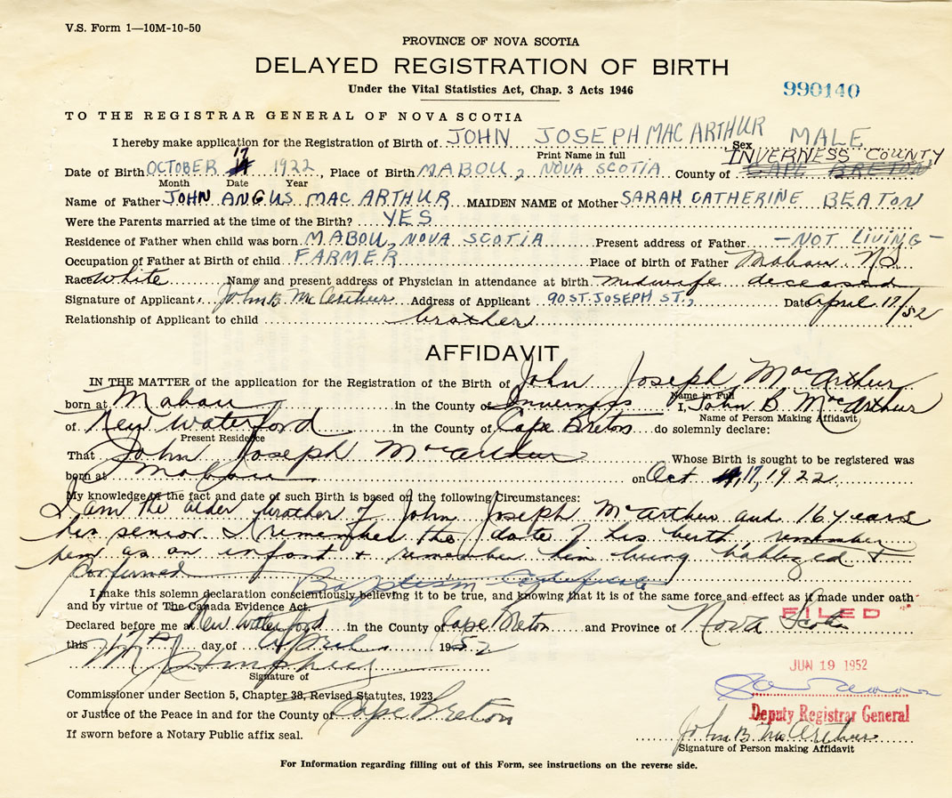 Name of Father John Angus MacArthur MAIDEN NAME of Mother Sarah Catherine Beaton