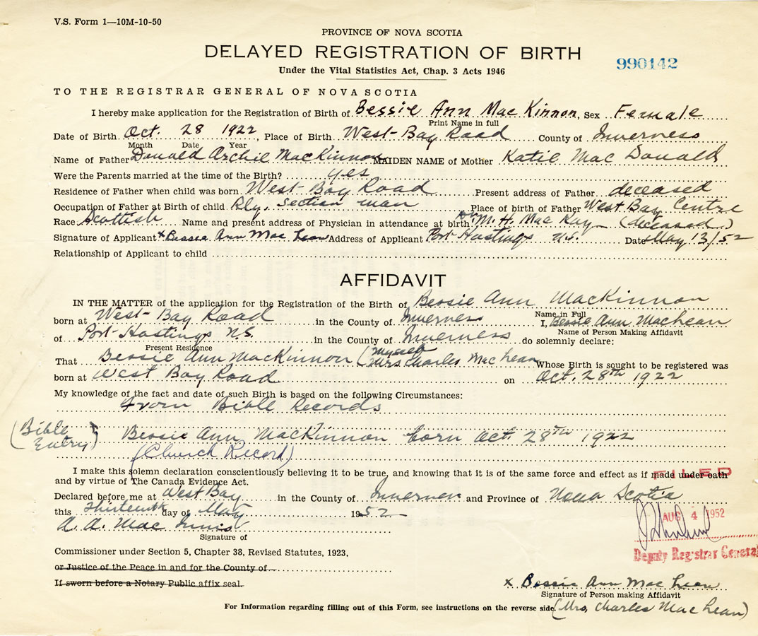 Signature of Applicant Bessie Ann MacLean Address of Applicant Port Hastings, Inverness Date 13 May 1952