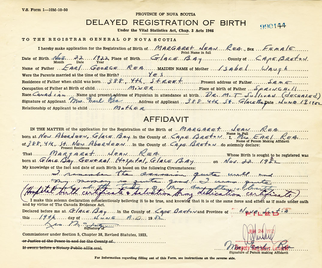 I hereby make application for the Registration of Birth of Margaret JeanRea Sex Female