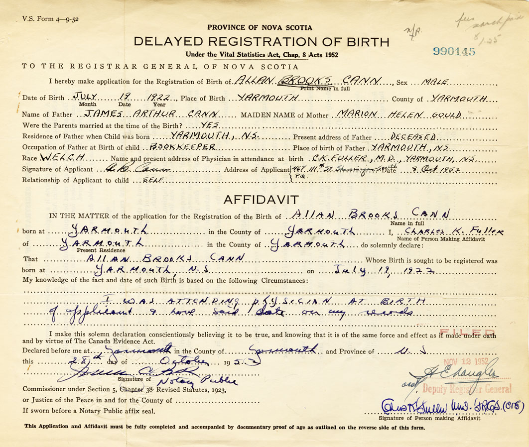 I hereby make application for the Registration of Birth of Allan BrooksCann Sex Male