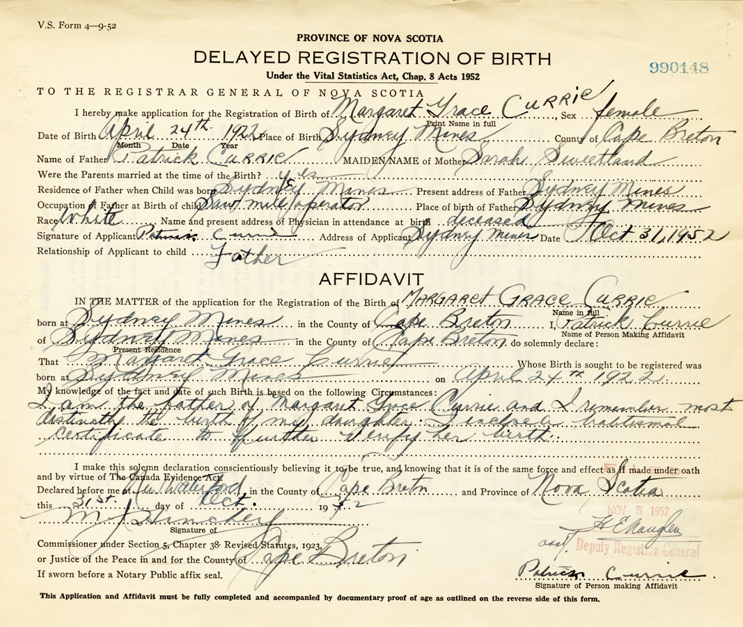I am the father of Margaret Grace Currie and I remember most distinctly the birth of my daughter. I enclosed baptismal certificate to further verify her birth.