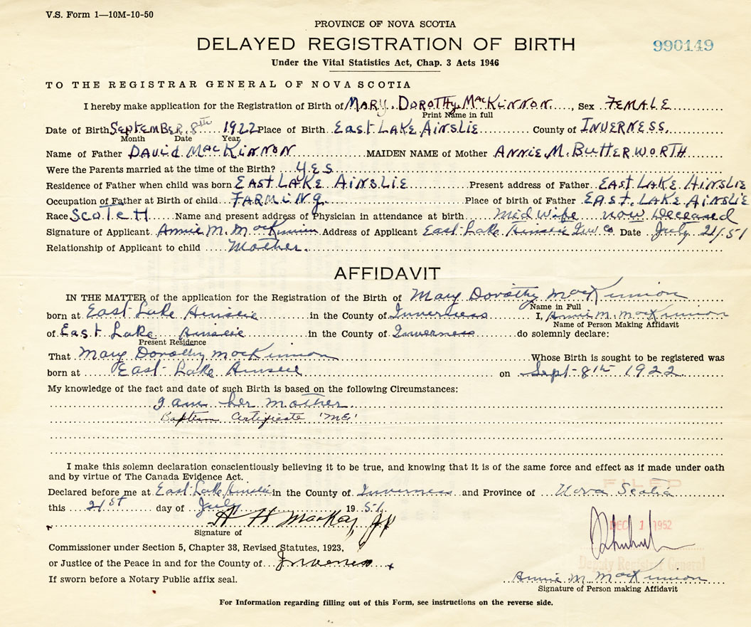 Signature of Applicant Annie M. MacKinnon Address of Applicant East Lake Ainslie, Inverness Date 21 July 1951