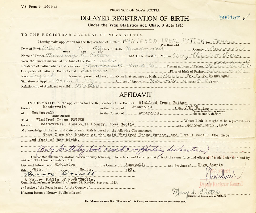 That I am the mother of the said Winifred Irene Potter and I well recall the date and fact of her birth. (baby birthday book record and supporting declarations)