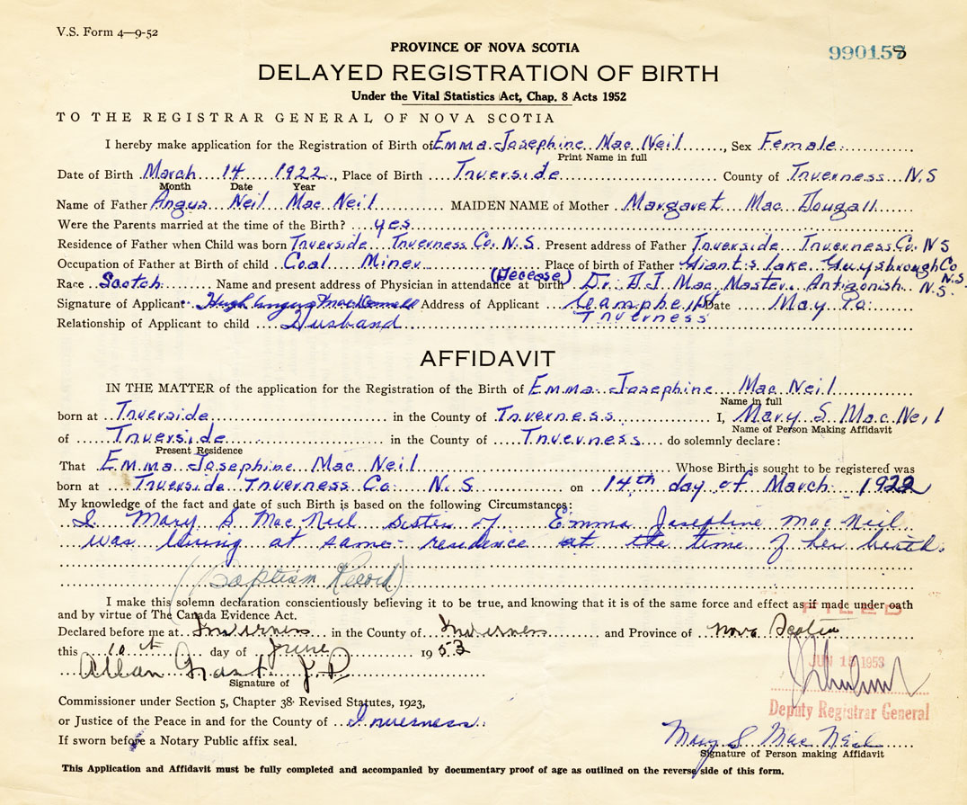 I hereby make application for the Registration of Birth of Emma JosephineMacNeil Sex Female