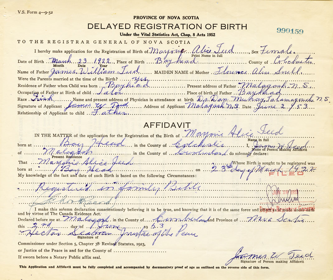 Date of Birth March 23, 1922 Place of Birth Bay HeadCounty of Colchester