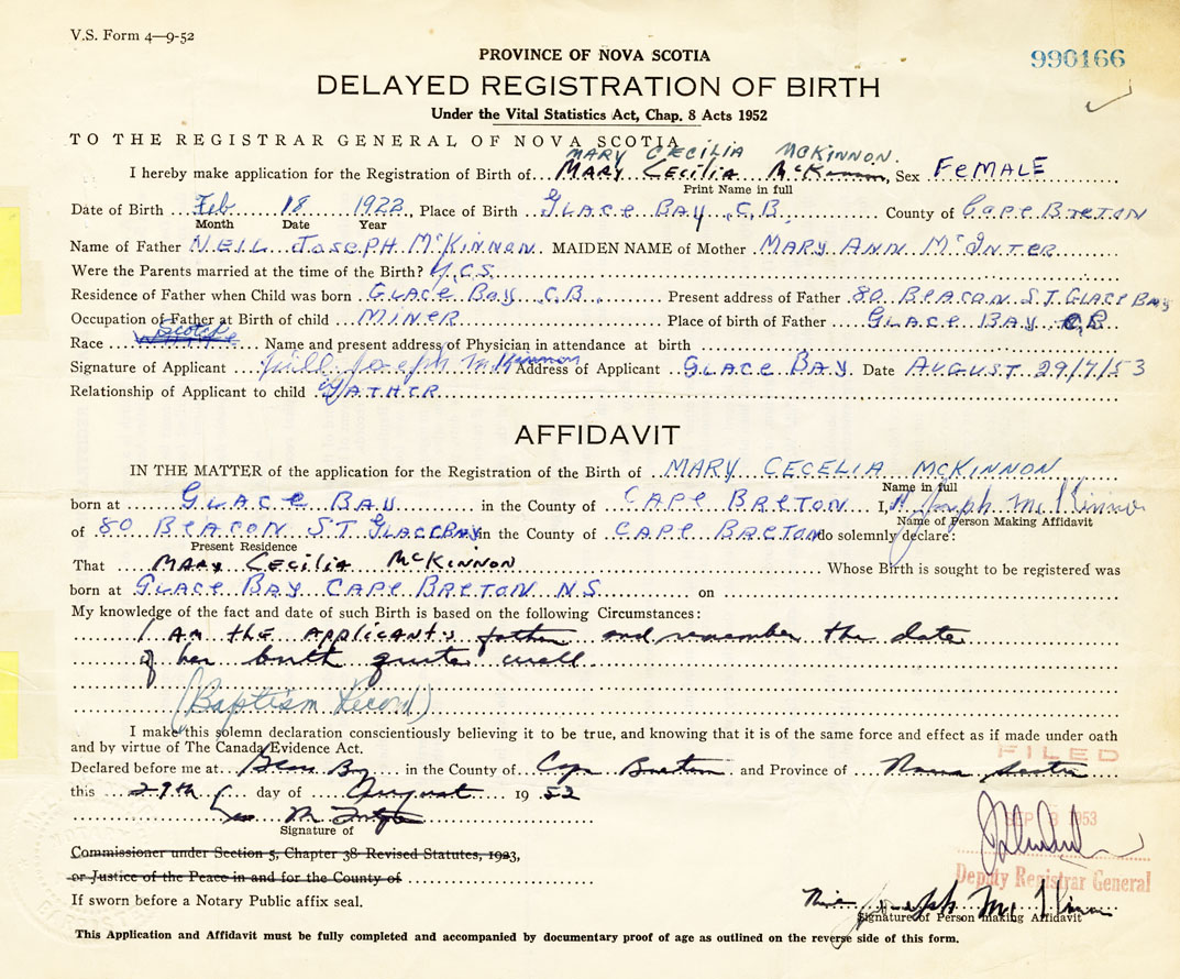 Signature of Applicant Neil Joseph Mackinnon Address of Applicant Glace Bay, Cape Breton Date 29 August 1953