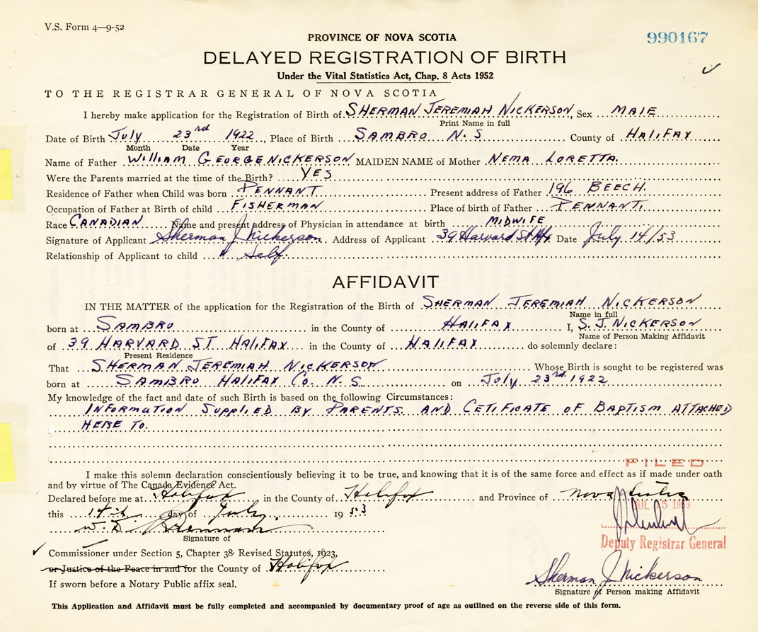 Signature of Applicant Sherman J. Nickerson Address of Applicant 39 Howard Street, Halifax Date 14 July 1953