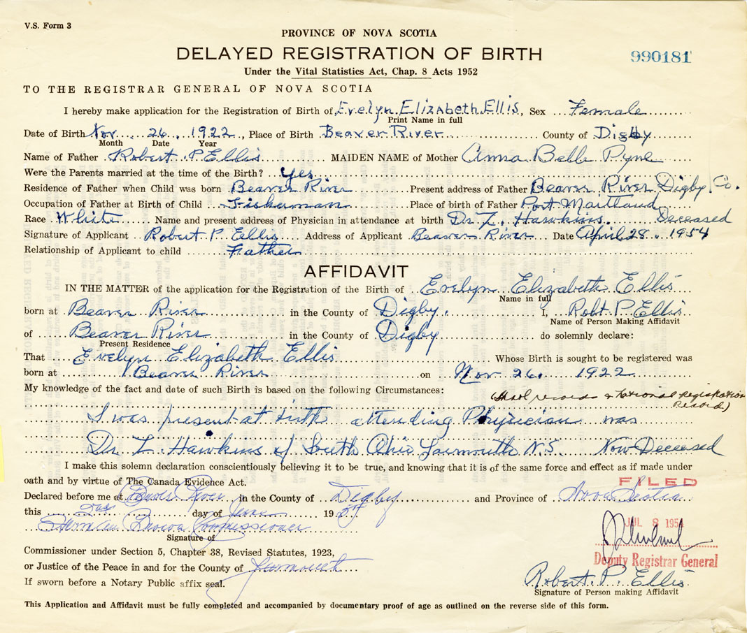 Date of Birth November 26, 1922 Place of Birth Beaver RiverCounty of Digby