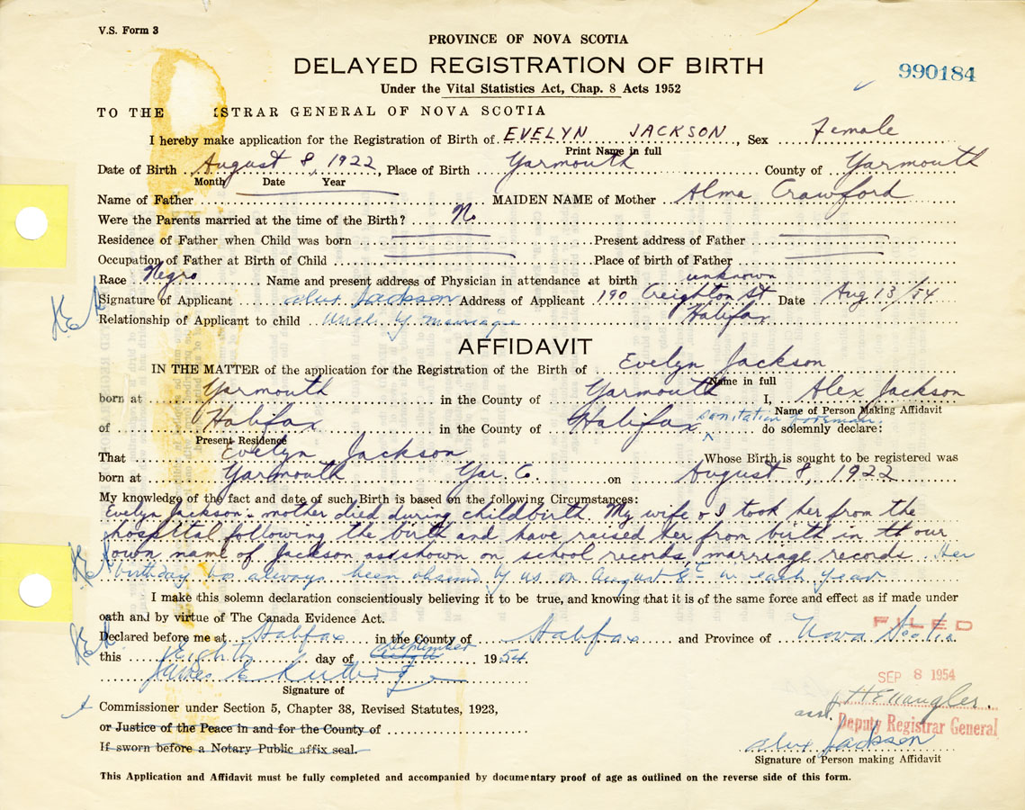 Evelyn Jacksons mother died during childbirth. My wife and I took her from the hospital following the birth and have raised her from birth in our own name of Jackson as shown on school records and marriage records. Her birthday has always been observed by us on August 8th each year.