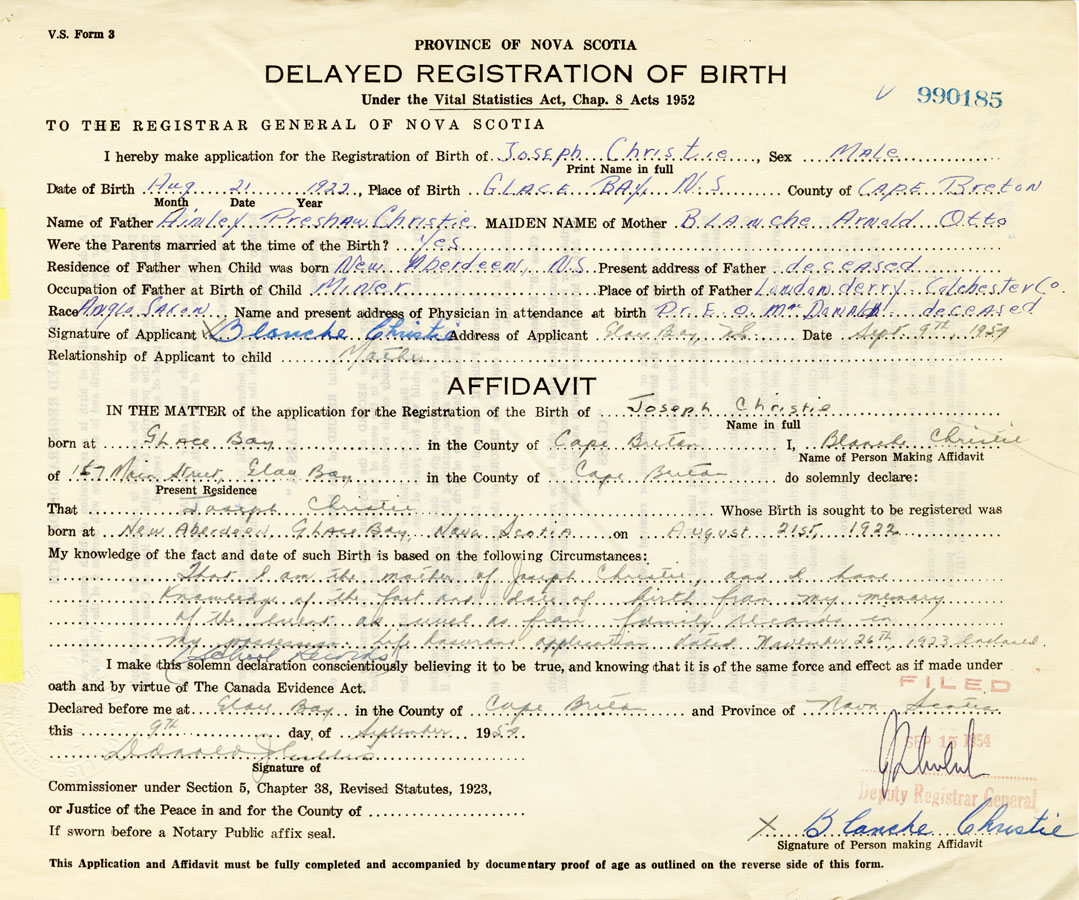 Signature of Applicant Blanche Christie Address of Applicant Glace Bay, Cape Breton Date 9 September 1954