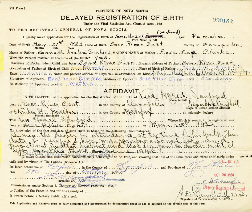 Date of Birth May 21, 1922 Place of Birth Bear River EastCounty of Annapolis