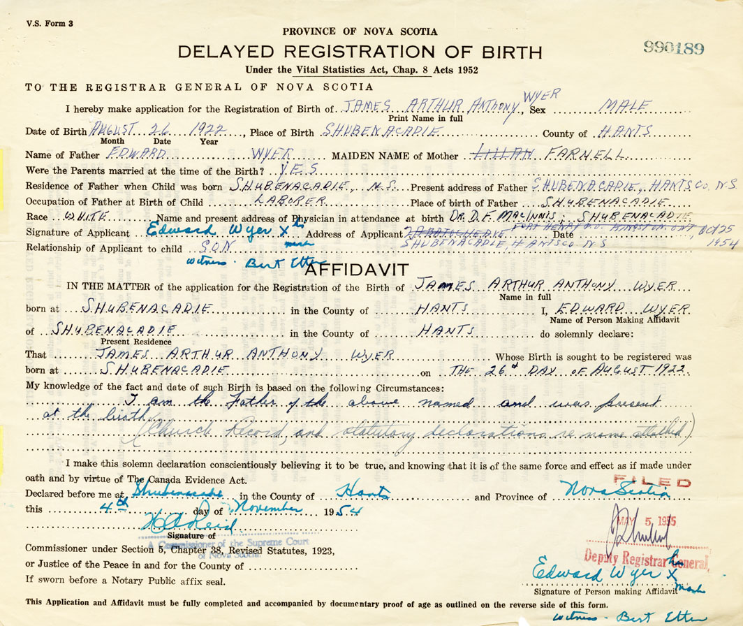 Signature of Applicant Edward Wyer Address of Applicant Shubenacadie, Hants Date November 1954