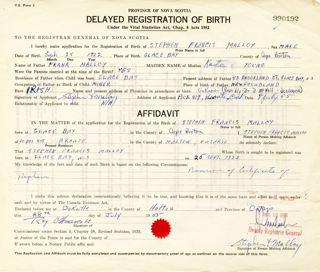 Date of Birth September 25, 1922 Place of Birth Glace BayCounty of Cape Breton