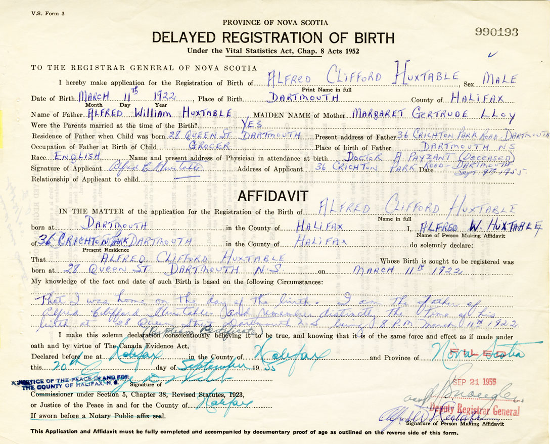 That I was home on the day of the birth. I am the father of Alfred Clifford Huxtable and remember distinctly the time of his birth at 28 Queen Street, Dartmouth being 8pm on March 11th, 1922. (baptism certificate)