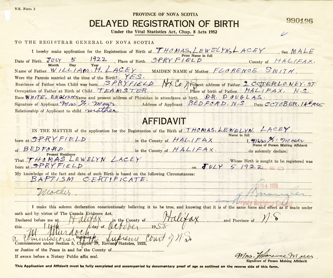 Date of Birth July 5, 1922 Place of Birth SpryfieldCounty of Halifax