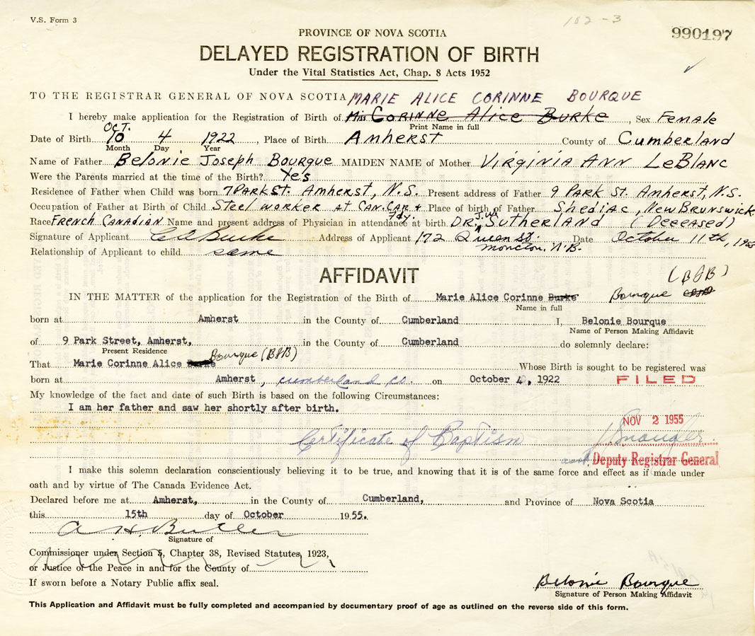 I hereby make application for the Registration of Birth of Marie Alice CorinneBourque Sex Female