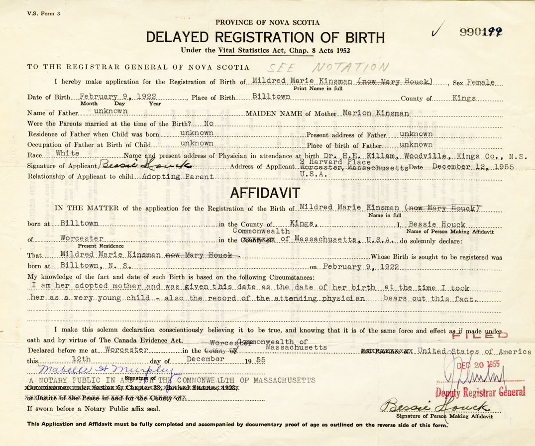 IN THE MATTER of the application for the Registration of the Birth of Mildred Marie (Mary)Kinsman (now Houck)