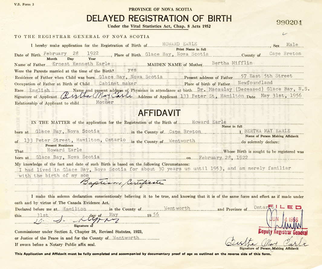 I hereby make application for the Registration of Birth of HowardEarle Sex Male