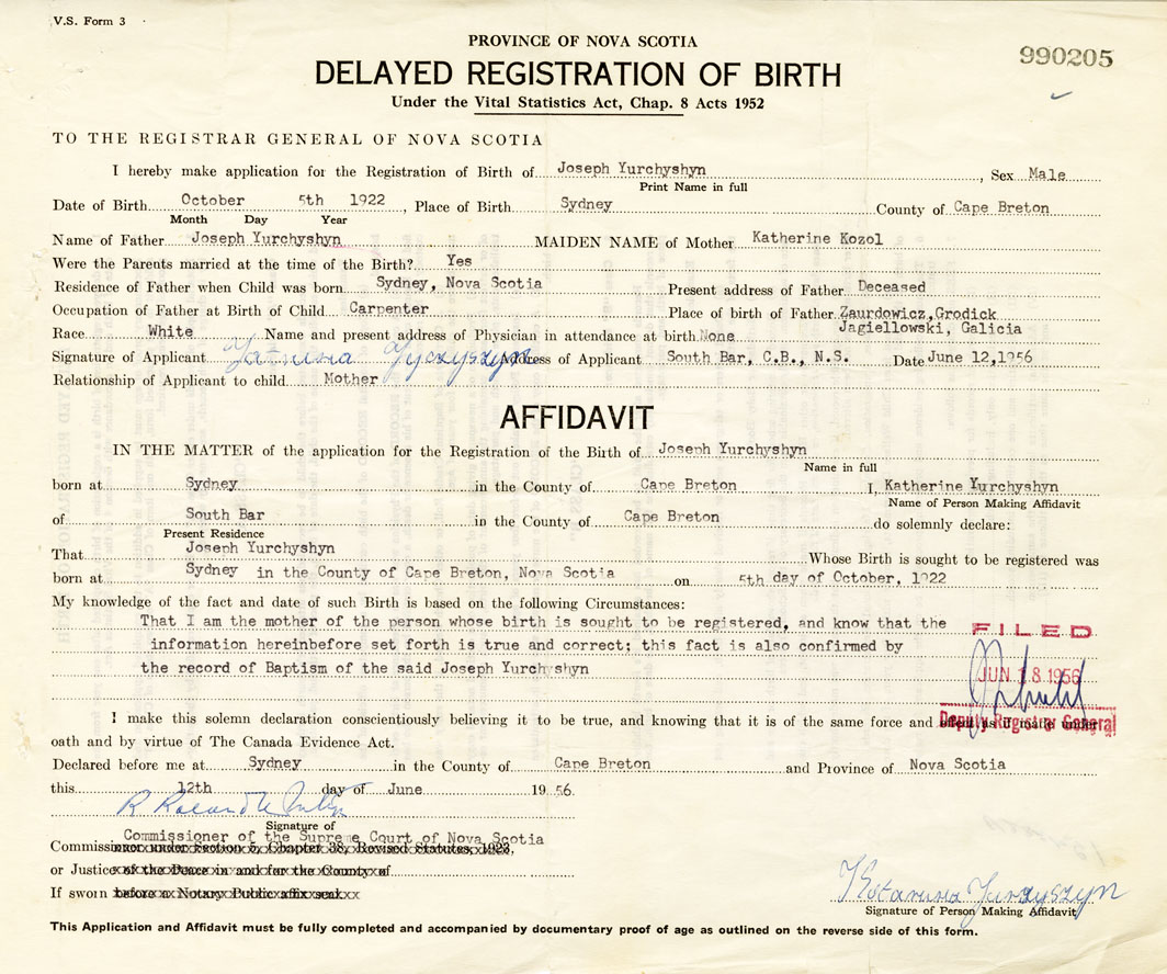 I hereby make application for the Registration of Birth of JosephYurchyshyn Sex Male