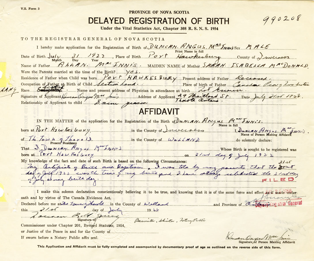 I hereby make application for the Registration of Birth of Duncan AngusMacInnis Sex Male