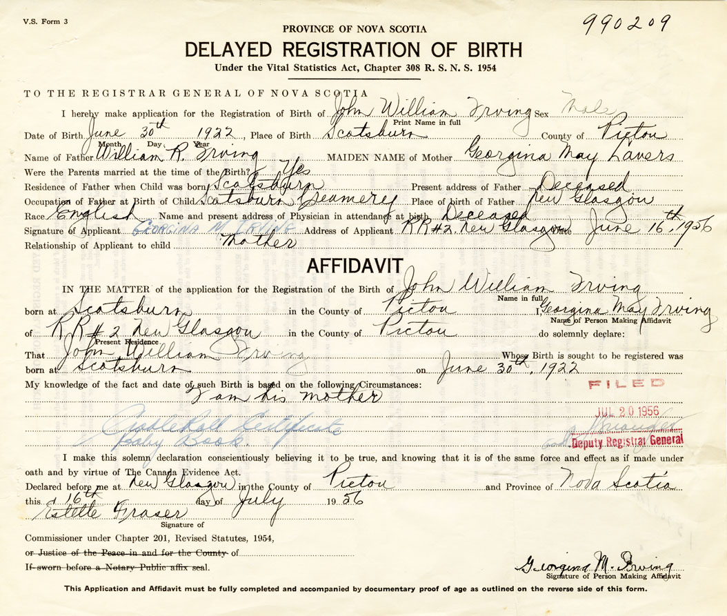 Date of Birth June 30, 1922 Place of Birth ScotsburnCounty of Pictou