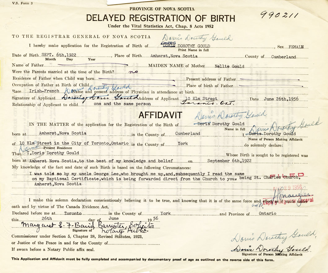 Signature of Applicant Dorris Dorothy Gould Address of Applicant 10 Elm Street, Toronto, Ontario Date 26 June 1956