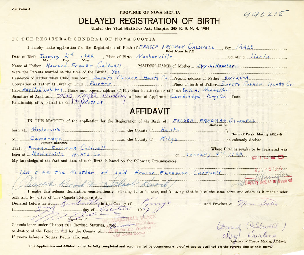 Name of Father Howard Fraser Caldwell MAIDEN NAME of Mother Ivy L. Nowlan