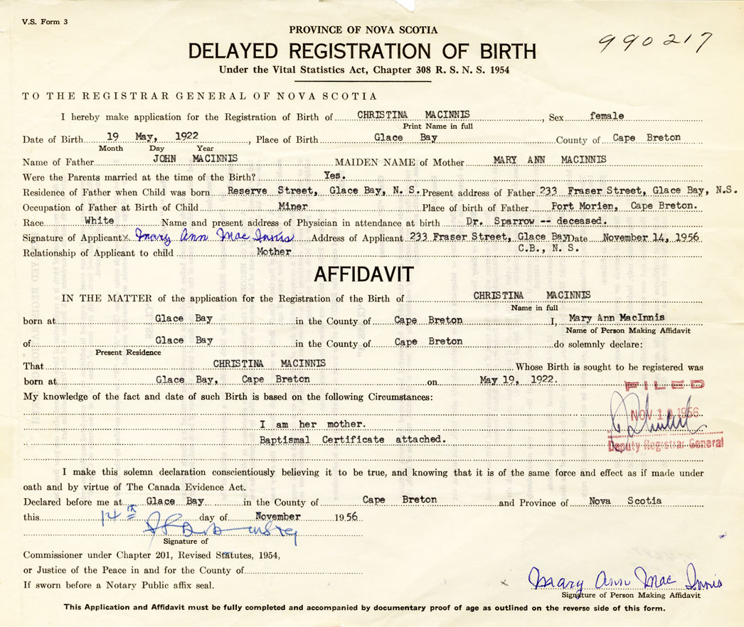 Signature of Applicant Mary Ann MacInnis Address of Applicant 233 Fraser Street, Glace Bay, Cape Breton Date 14 November 1956