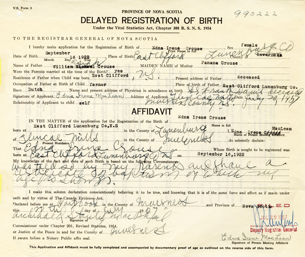 I hereby make application for the Registration of Birth of Edna IreneCrouse Sex Female