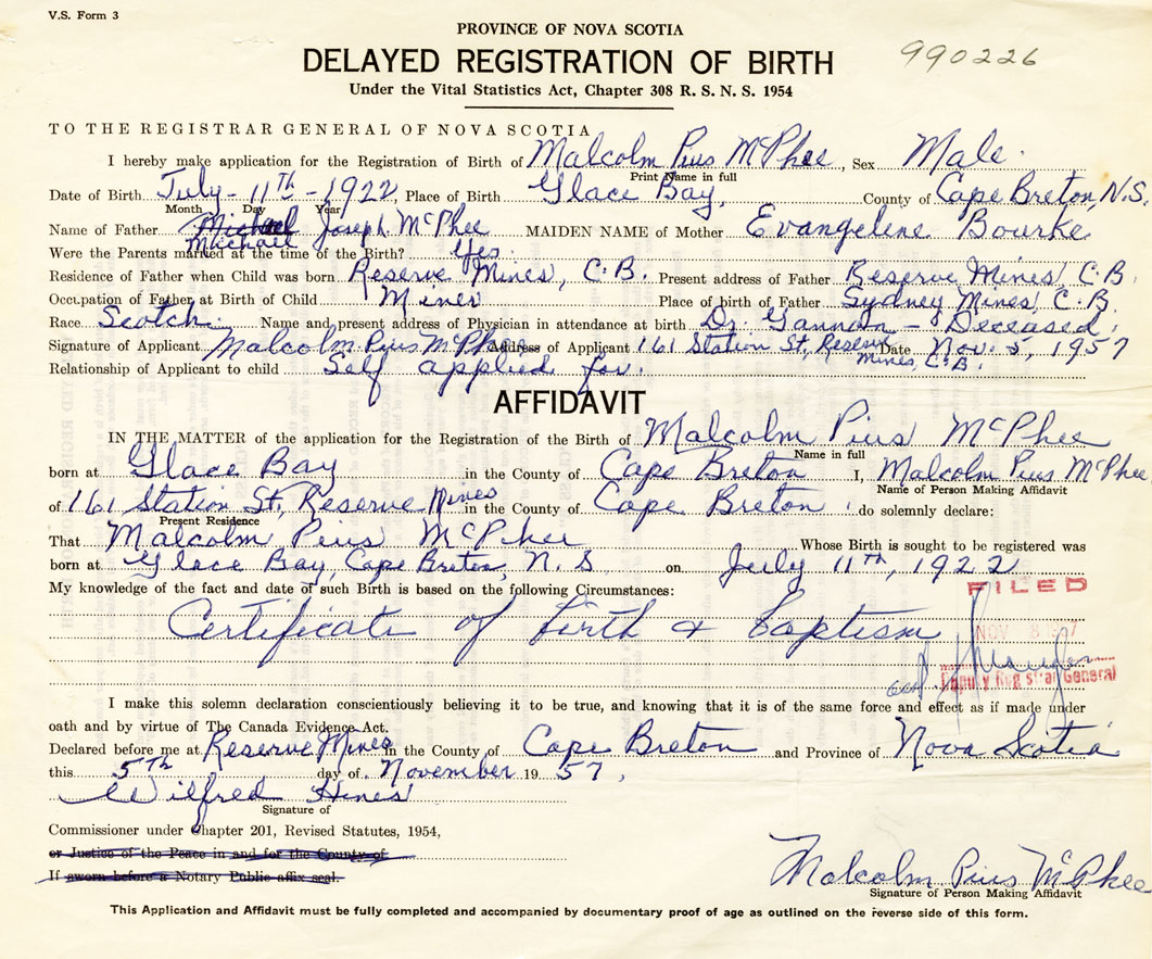 Signature of Applicant Malcolm Pius McPhee Address of Applicant 161 Station Street, Reserve Mines, Cape Breton Date 5 November 1957