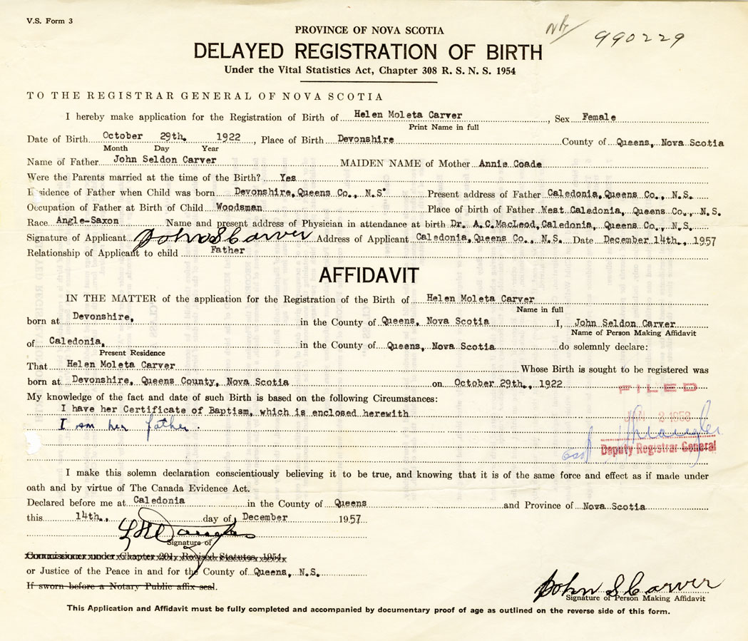 I hereby make application for the Registration of Birth of Helen MoletaCarver Sex Female