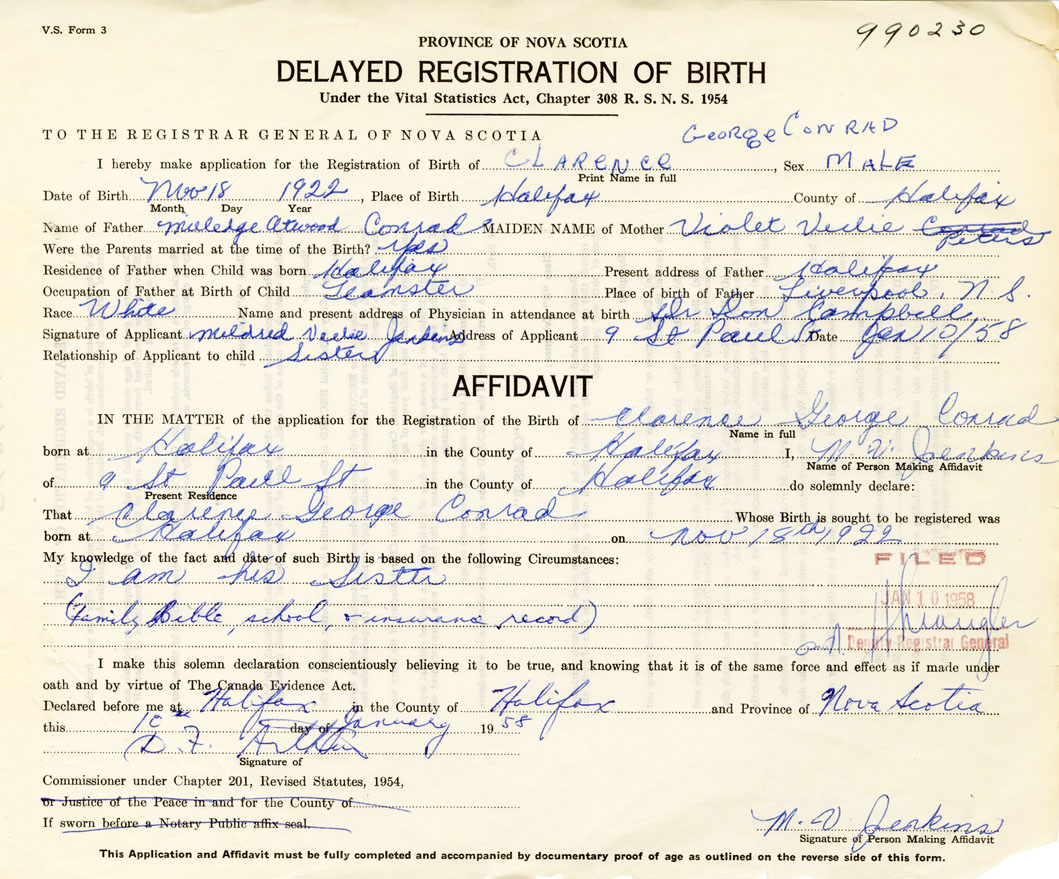 IN THE MATTER of the application for the Registration of the Birth of Clarence GeorgeConrad