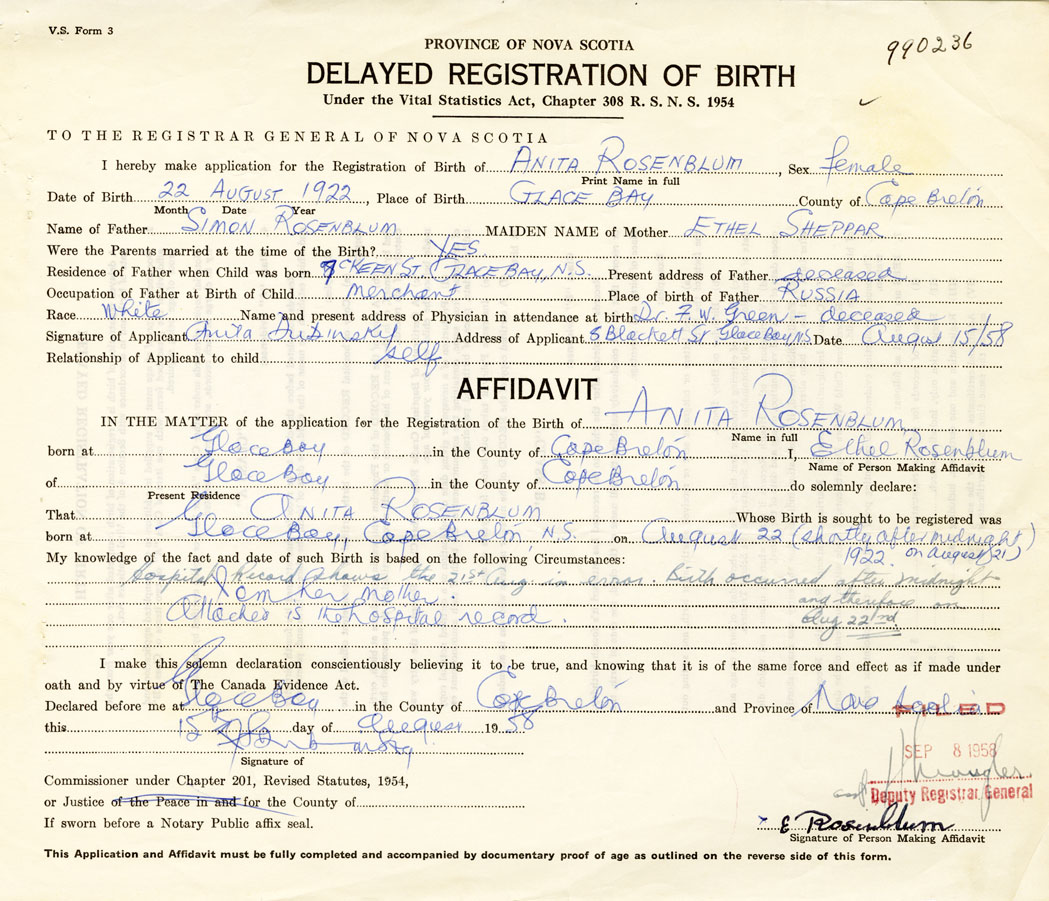 Signature of Applicant Anita Dubinsky Address of Applicant 5 Blockett Street, Glace Bay, Cape Breton Date 15 August 1958