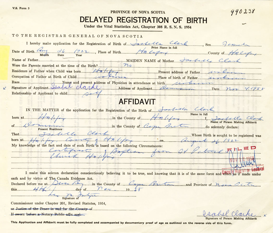 Signature of Applicant Isabel Clarke Address of Applicant Dominion, Cape Breton Date 4 November 1958
