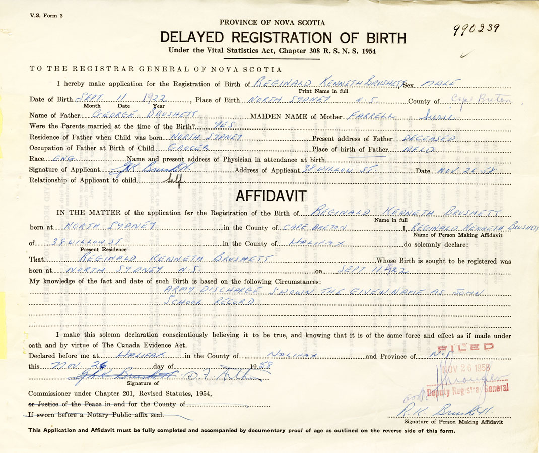 I hereby make application for the Registration of Birth of ReginaldBrushett Sex Male
