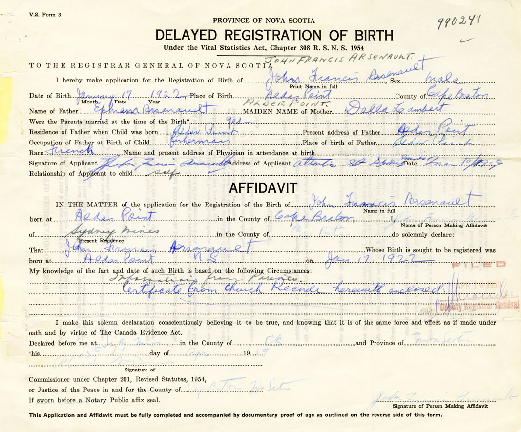 Signature of Applicant John Francis Arsenault Address of Applicant Atlantic Street, Sydney, Cape Breton Date 1 March 1959